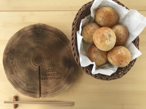 木を輪切りにしたお皿とパン。まさかお皿だとは思わなんだ。