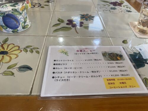 食事メニューは名物のカントリーライスをはじめ、高菜ピラフ、カレー(キーマ or ビーフ)、パスタ(ナポリタン・クリーム・明太子)、シチュー(ビーフ・クリーム・ボルシチ)など種類豊富。