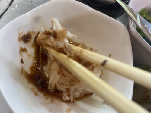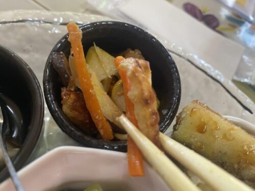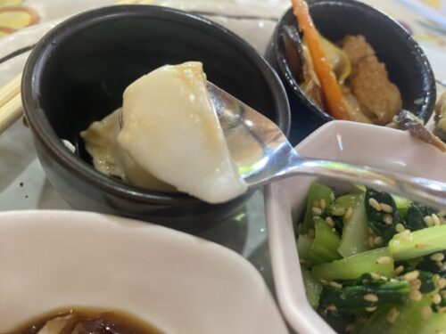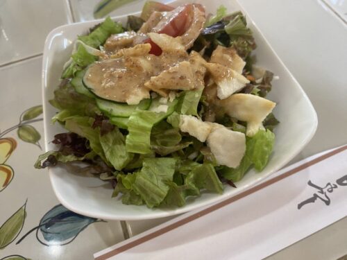 サラダにはごまドレッシングとおせんべいが乗っています。パリパリした触感が楽しい。