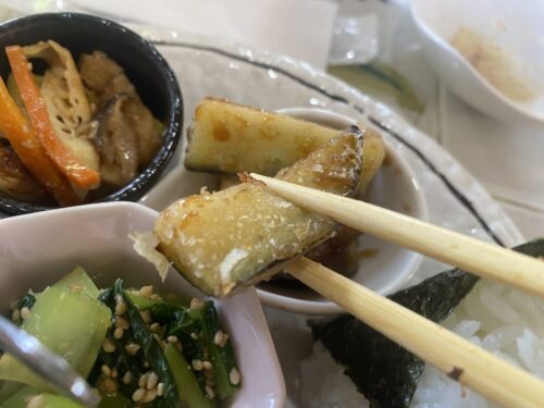 ナスの唐揚げ。噛むと、じゅわっと甘辛い味が広がります。