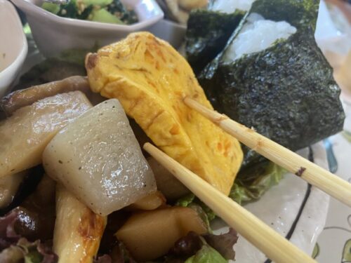 あまじょっぱい卵焼きの下には、煮物が入っています。