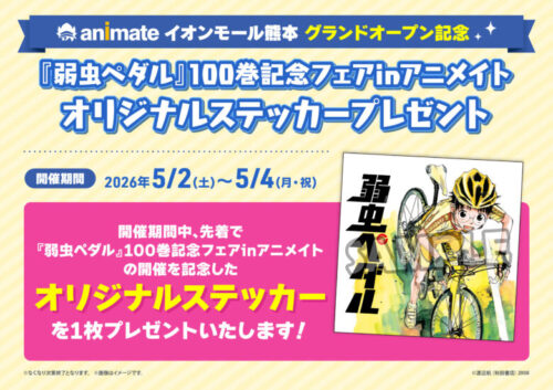 次に5月2日~4日の期間中、先着で「弱虫ペダル」100巻記念フェアinアニメイトの開催を記念したステッカーを1枚プレゼント!