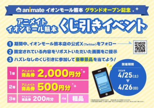 また期間中、アニメイトイオンモール熊本の公式X(@animateamkuma)のフォローと、該当のポストをリポストした画面のご提示でハズレ無しのくじ引きに参加できます。