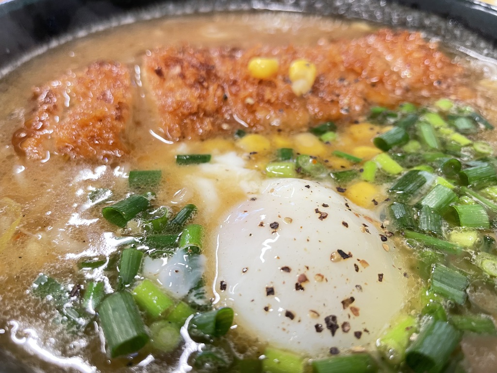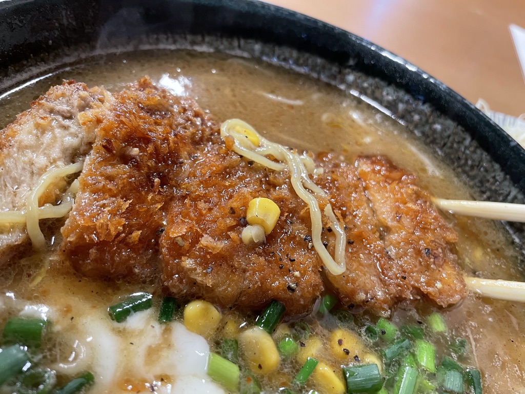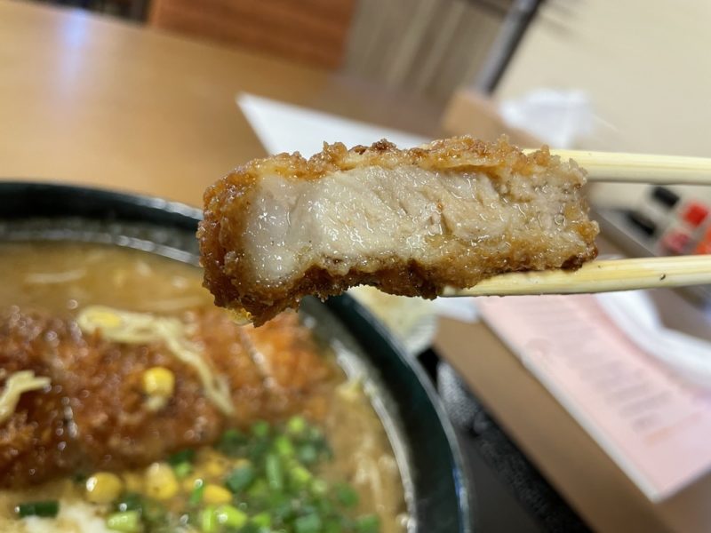 まずカツだけ食べましたが、油はスープで落とされ、衣に味噌スープの味が染み込んでいて正しく「味噌トンカツ」ですよ。味噌ラーメンのトンカツ乗せではなく、味噌トンカツラーメンというネーミングの意味を理解しいました。