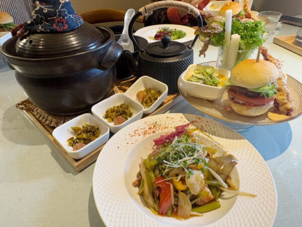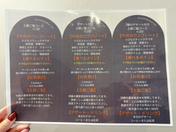 今回ご紹介するのは、真ん中のデザートが1品ついたメニューです。今月のワンプレート・選べるメイン・土鍋ご飯・お茶漬け・デザート1品・ドリンクのラインナップ。