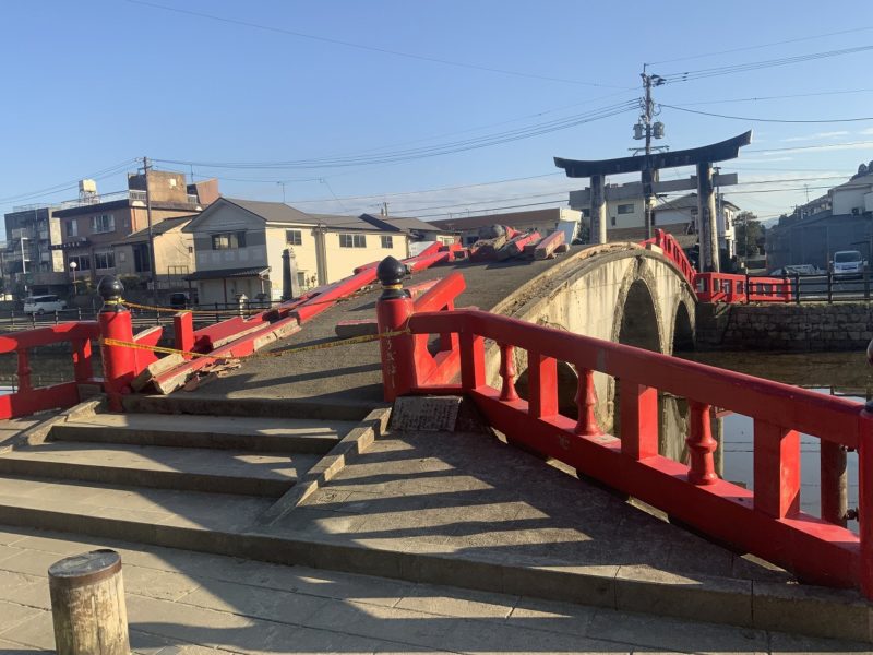 境内に入るより前から、まず目に入るのは参道にかかる「みそぎばし」。水没していまい、現在、復旧作業が続いています。
