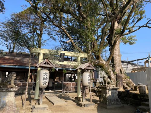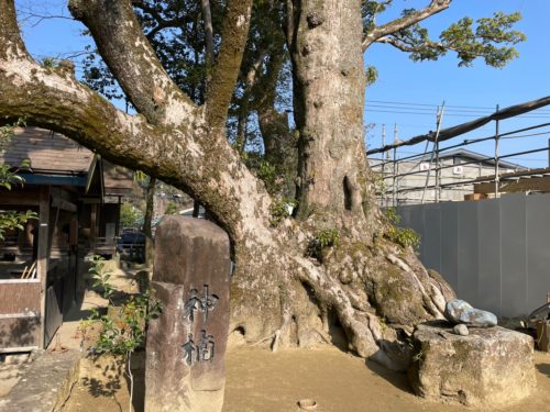 鳥居の右横にそびえるのが、御神木の楠です。