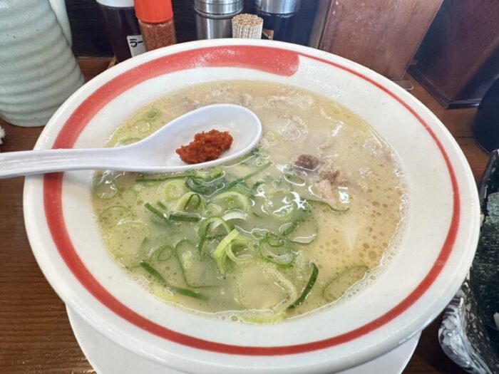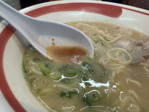 お店の人に聞いたところ、久留米ラーメンより麺がちょい太で熊本ラーメンより細く、どちらでもないそう。まさに熊本県と福岡県の県境のラーメンということでしょうか。