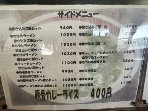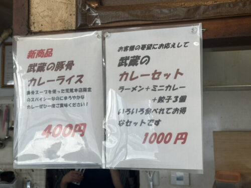 メニューは豚骨ベースの武蔵ラーメンをはじめ味噌豚骨ラーメンなどがあります。