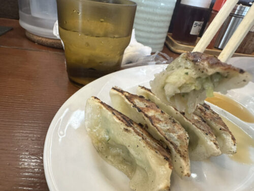 餃子5個入りは野菜たっぷり。ビールが欲しくなります。