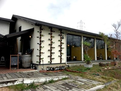 壁にたくさんのワインの空瓶が取り付けてあるというユニークなデザイン!