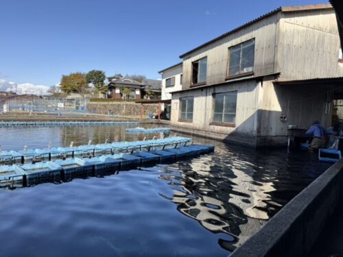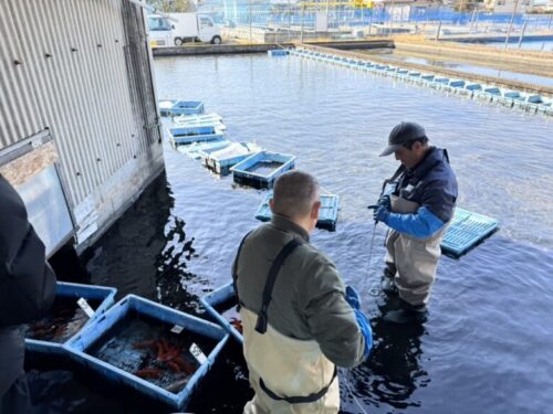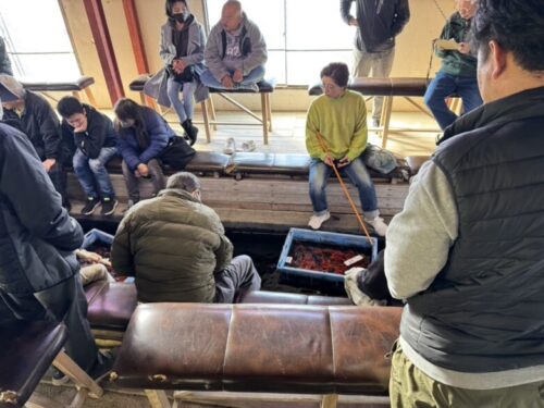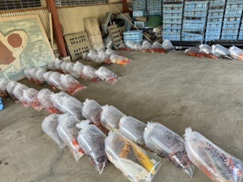 こうして、カゴに入れられた金魚や鯉が、競り場に流されます。寒い中お疲れ様です!