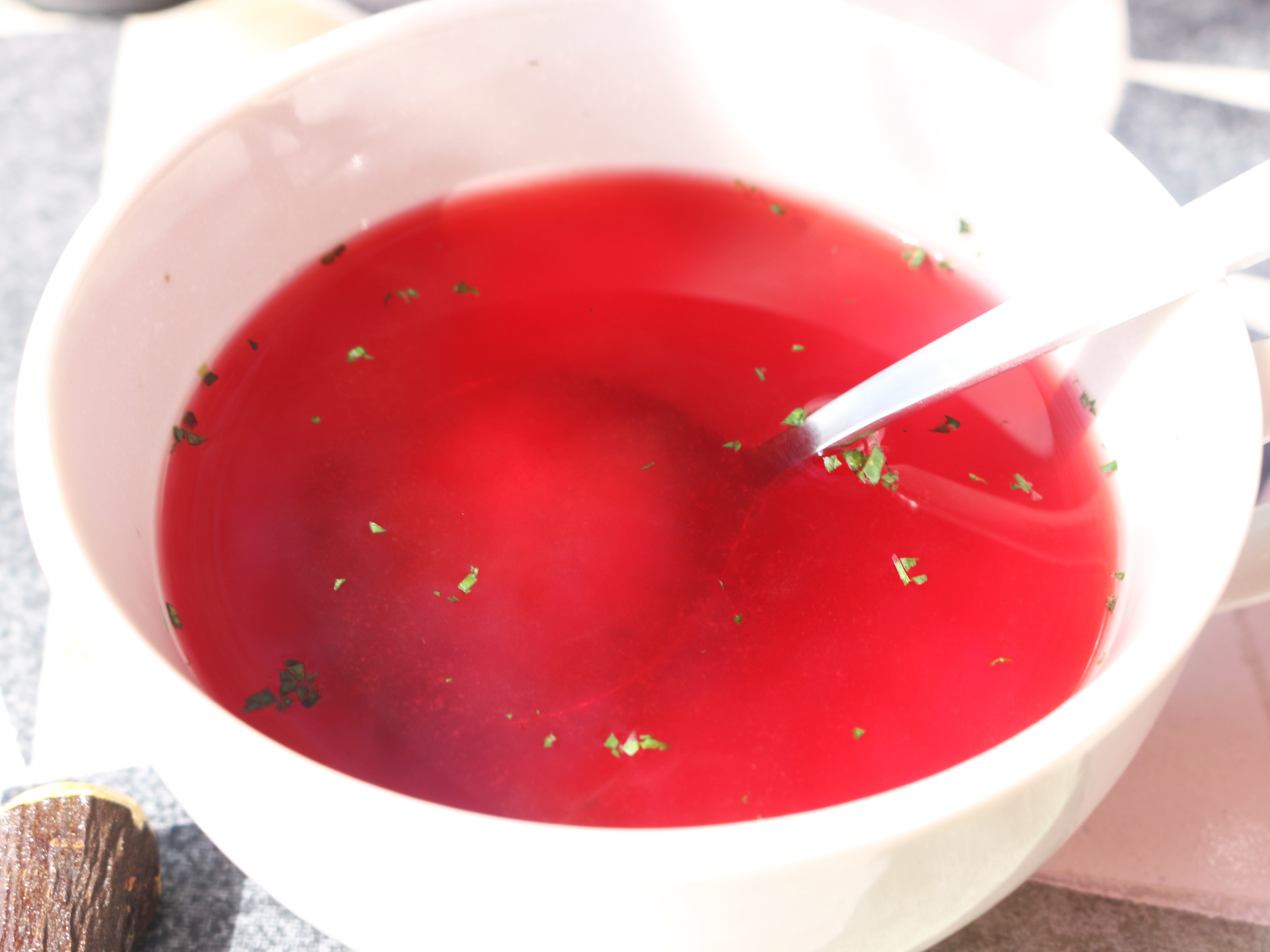まずは、季節野菜のスープが出てきました。甘めの味付けです。野菜の甘味がそのまま溶け出しています。