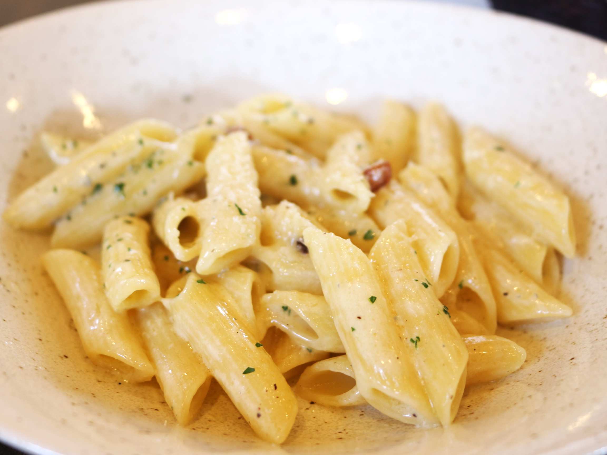 ゴルゴンゾーラのペンネは硬めの茹で加減。ゴルゴンゾーラチーズのソースがしっかり絡まり、その上に細かく刻まれたチーズがたっぷりと降りかけてあります。