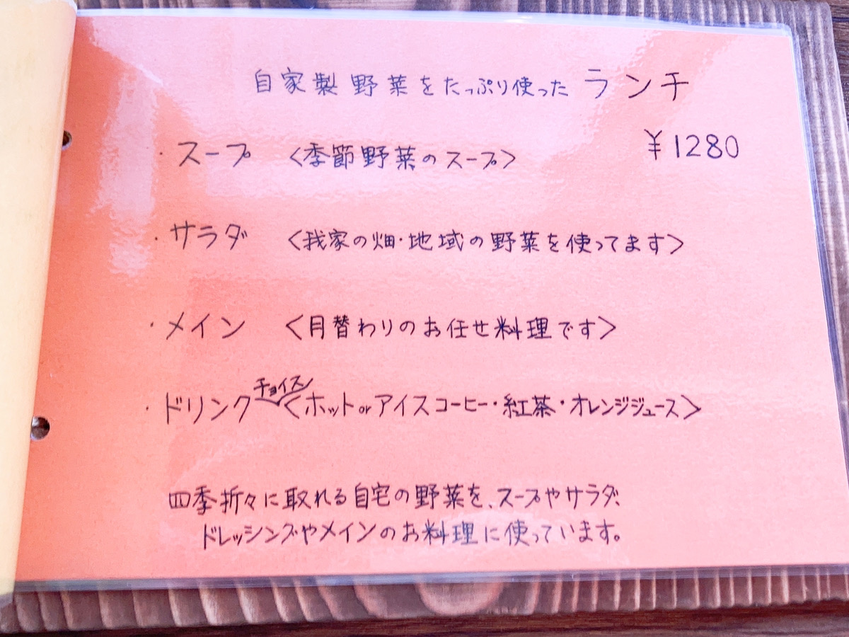 ランチメニューを見てみると1種類。その名も『自家製野菜をたっぷり使ったランチ』1280円。