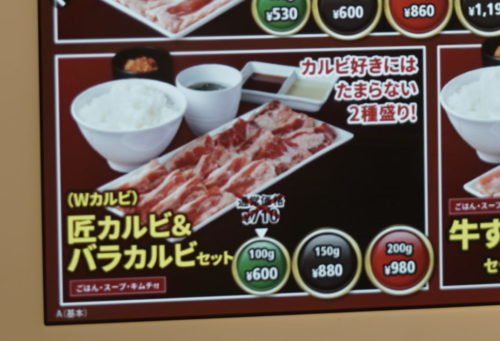 直視する。カルビ2種100g・ご飯・ワカメスープ・キムチこれで夜も600円。非の打ち所がない。