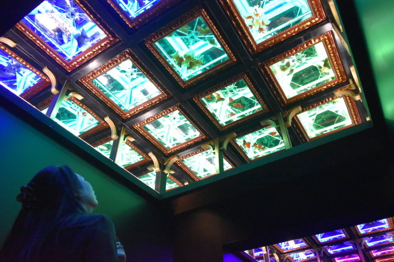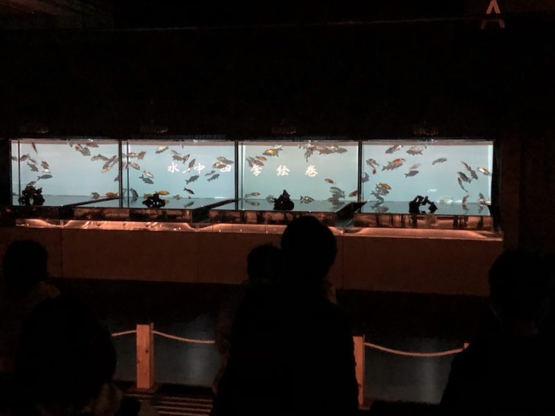 上を向いてみると、天井に金魚が!!!! 「天井金魚」とタイトル通りの作品は、水族館でしか体験できないような違った角度から金魚を見ることができます。金魚のお腹って、見る機会は少ないので新鮮。案外ぽよんとしたお腹…。