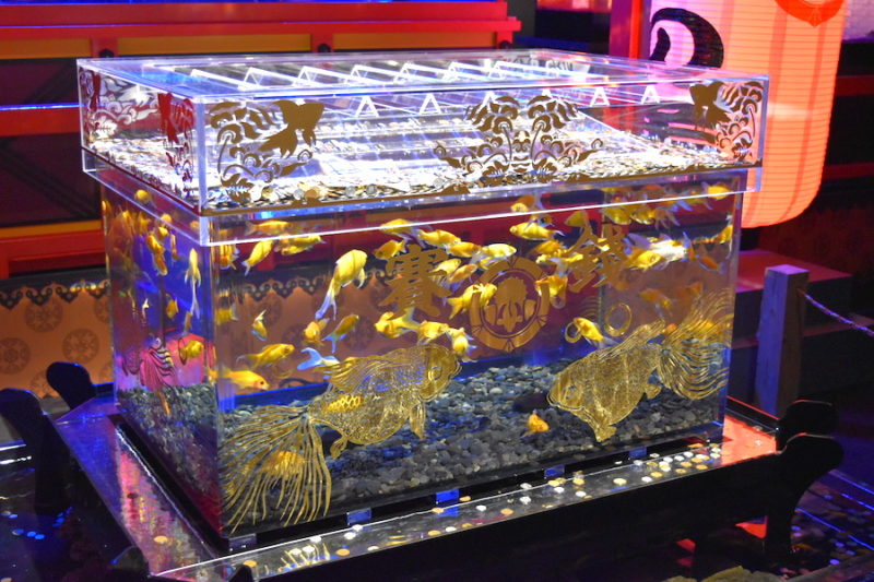 そして、中央にどどんと置かれているさい銭箱型の水槽「祈願金魚箱」。勉強不足でしたが、金魚って繁栄の象徴らしいです。さらに、金色の金魚ってものすごくご利益ありそうじゃないですか。念入りに金運アップを祈願しておきました。