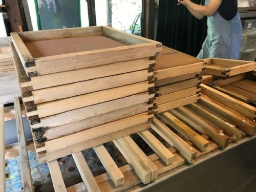 この漉き桁(すきけた)で原料を水平にすくい、和紙を作っていきます。