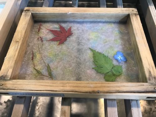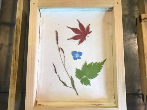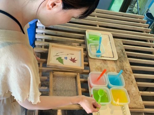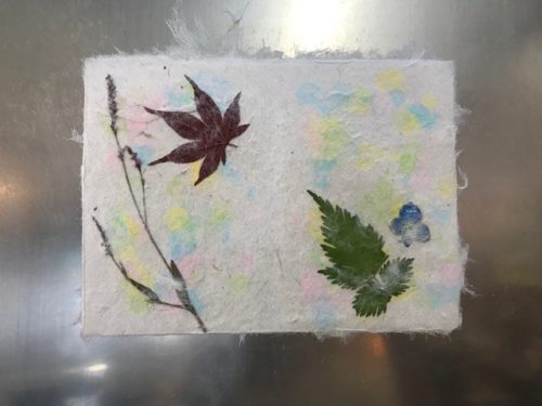 和紙の原料に押し花の飾りと色付けをしていきます。