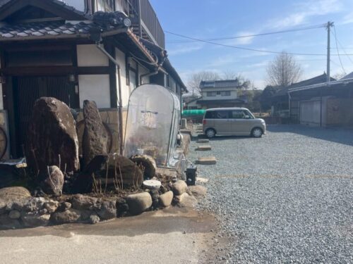 お店の前のほか、裏側にも広い砂利の駐車場があり、こちらに車をとめることができます。