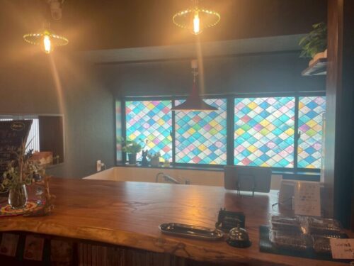 一枚板のカウンター奥には、ステンドグラス仕様の窓。