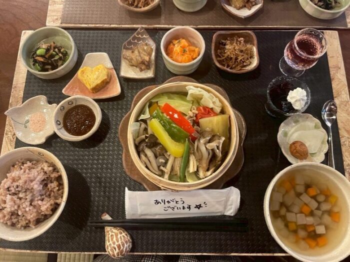 お盆の中央には、せいろがあり、雑穀米、のっぺ汁、そしてたくさんの小鉢が並びます。