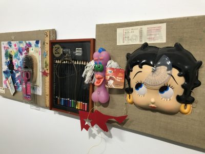 ベティーちゃんのお面や文房具が配された作品。タイトルは「Memory of NYC」(清水晃 作)。単純にかわいいです。遊び心満載の作品。
