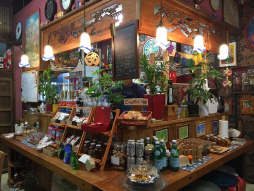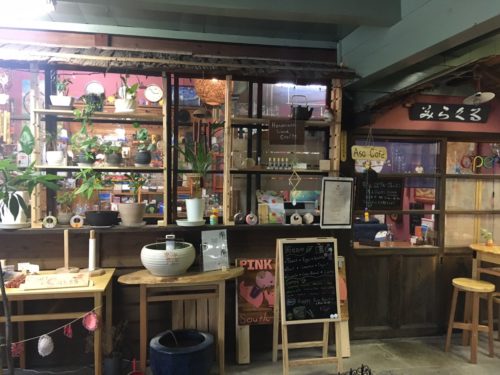 キッチンを取り囲むカウンターに、観葉植物やオーガニックアップルジュース、無農薬珈琲など、たくさんのグッズが並んでいて、見るだけで心が弾む雑貨屋さんのようです。土偶グッズなんかもあるカオスな雰囲気も最高!
