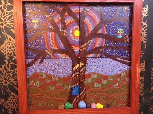 マットさんは絵も描かれるそうで、こちらの点描の絵画は、3週間かけて製作されたという力作です。カラフルで独特な世界観に、思わず引き込まれてしまいます。