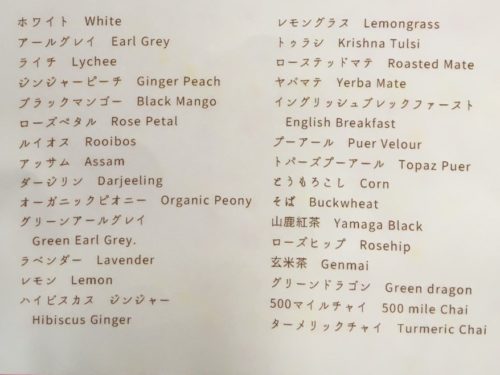 ドリンク類も、プロテインスムージーにハーブティー、そば茶やとうもろこし茶に加え、グリーンドラゴンや500マイルチャイなど、「これってなに?」と聞いてみたくなるドリンクまで、バリエーション豊富です。