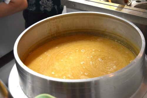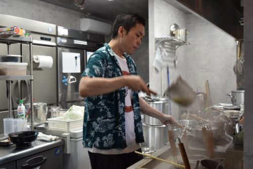 厨房には、でっかい寸胴に入った濃厚そうな豚骨スープ。12時間以上煮込んで、丁寧に旨みを出しているそうです。黄金色に輝いていますよ。ここにマー油を足すとあのバランス良いスープが生まれるわけですね。