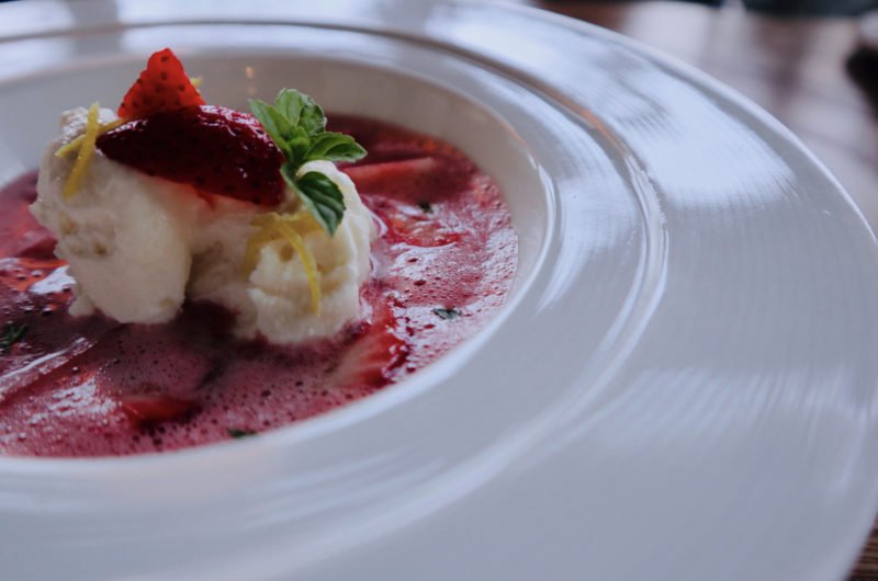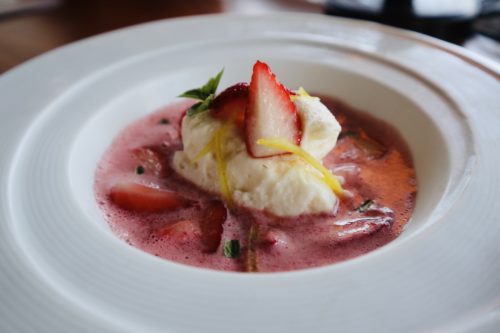 菊池産の苺をスープにされており、その中にふわっふわのレアチーズが浮いております。