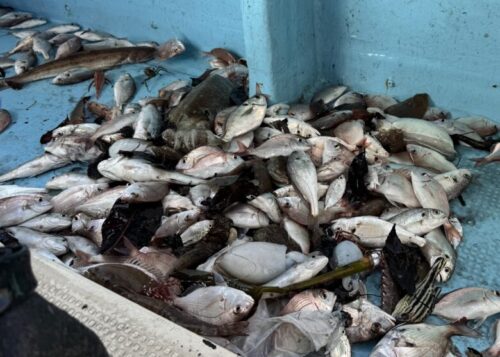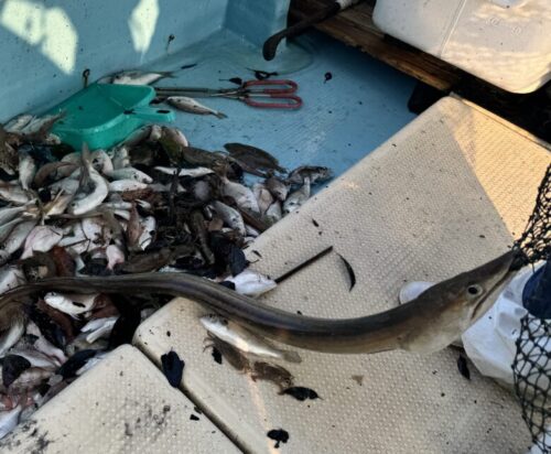 1度の投網(とあみ)で、これだけのお魚が獲れる中でアシアカエビは5匹程度しかいませんでした。