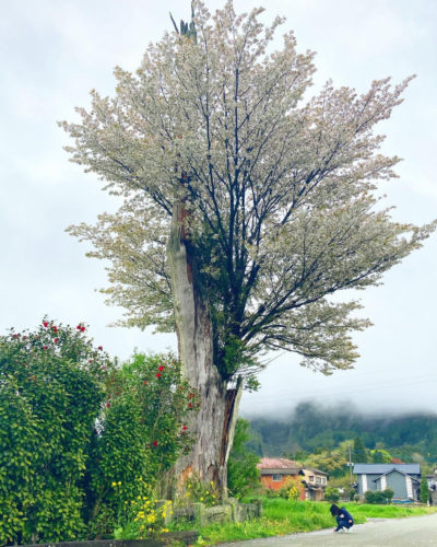 朽ちた杉の幹から、空へ伸びる桜の木。きれいです。