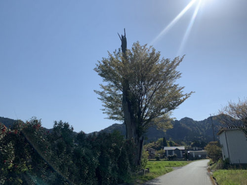 桜自体が特別大きいという訳ではないけれど、杉の幹は太く、折れた位置までの高さもかなりのもの。