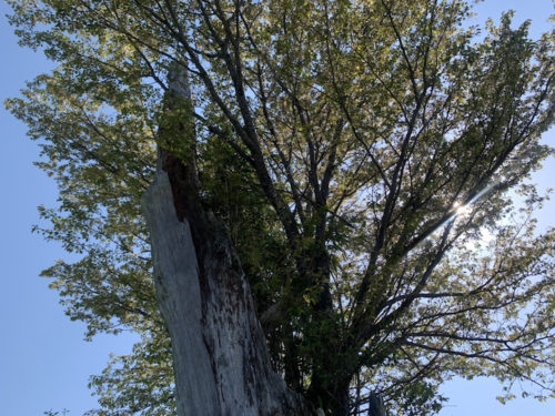 しれっと逆光ですが、のどかな田園風景の中に発見。不思議な木です。