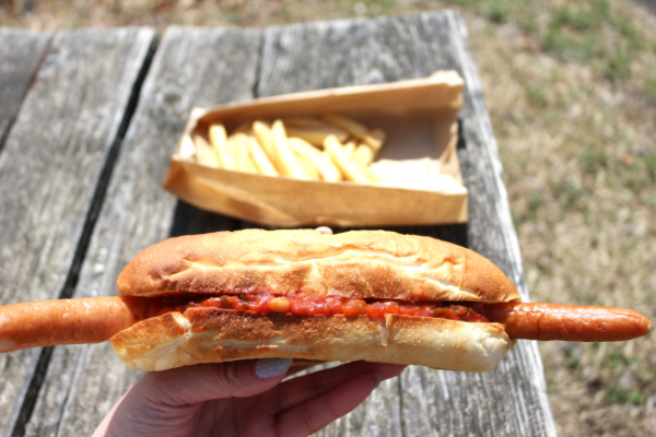 バイカーも多く来店されるそうですよ。色んなメニューがありましたが、今回は花見メシ。片手で手軽に食べられるホットドックをチョイスしました。