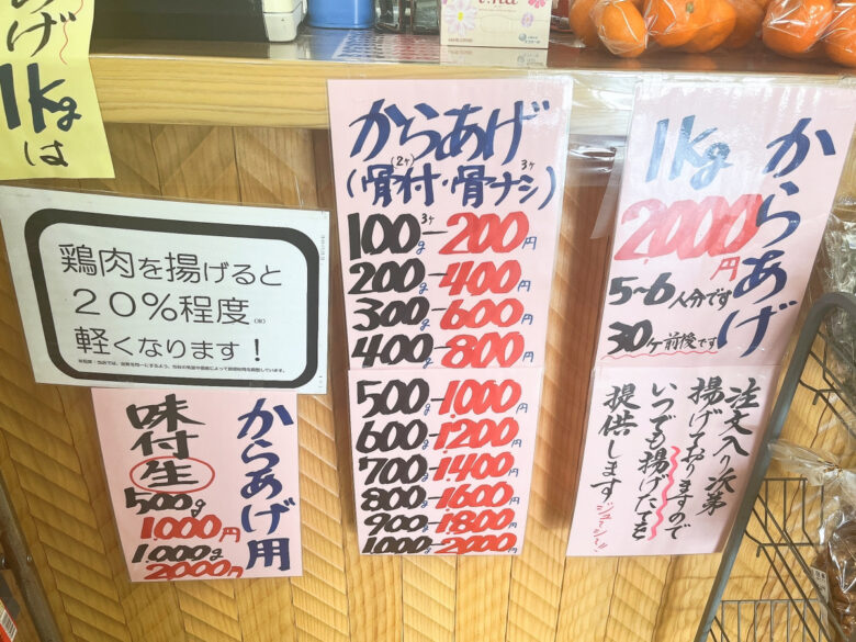 イートインもありますが、注文してから揚げる唐揚げが大人気でテイクアウトのお客さんが後を絶ちません。メニュー表には1kgの表示があります。そんなに買うの?と思いきや意外にも1kgや 2kg買うお客さんも多いそう。