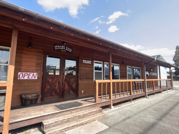 まずは一心行の大桜から車で約3分のところにある「ストロングボスサルーン」。西部劇を彷彿とさせるアメリカンな雰囲気のお店。ハンバーガーやホットドックにピザ、オムライスなどが食べられます。
