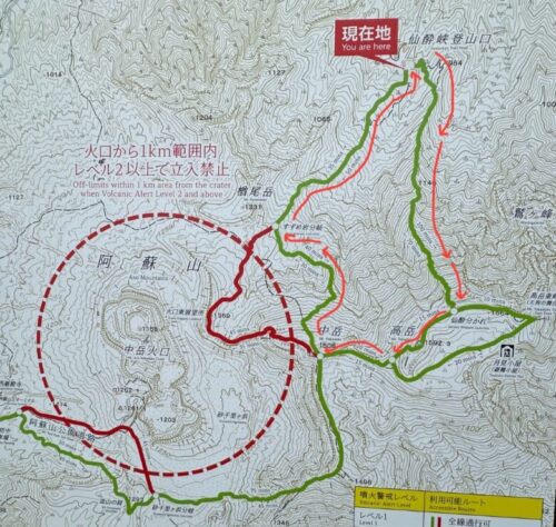 この日も火口から1キロ以内は入れませんでしたので、仙酔峡尾根ルートを登り、仙酔峡日ノ尾線を下山するコース(ピンクの線)を挑戦します。