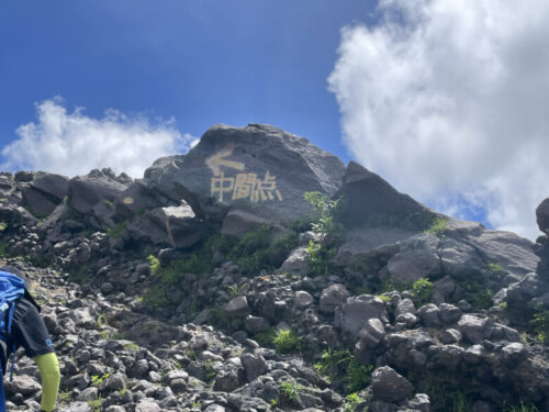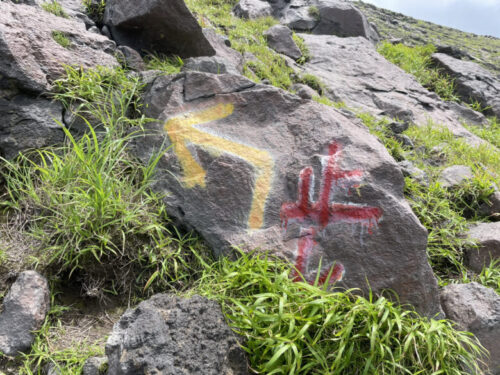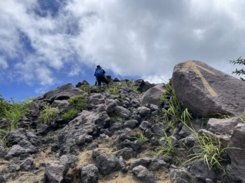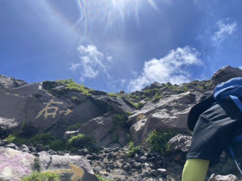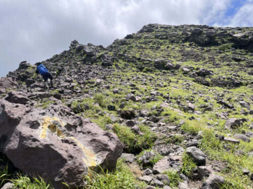 コース上の石に黄色い矢印や印がついているので、目印を通り山頂を目指します。