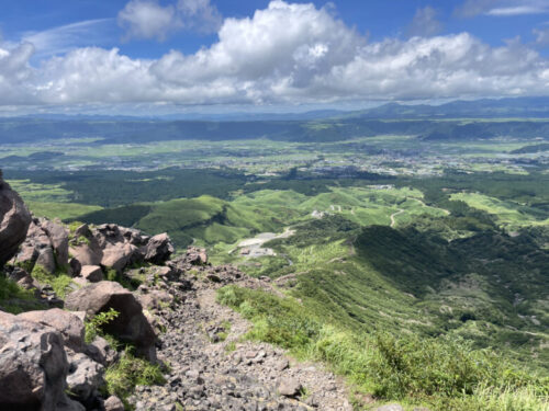 高岳から中岳に向かう途中、雲の晴れ間から阿蘇市が見えました。