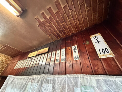 壁のメニューには「万十100円」がデカデカと貼ってあり、その横にお好み焼きのメニューが!