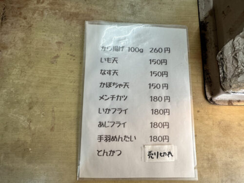 から揚げ、手羽めんたい、なす天を購入。いも天をサービスでつけてくれました!