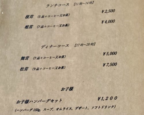 メニューがこちら。名前が全部茸ですが、茸メインのお料理が出てくるわけではありません。