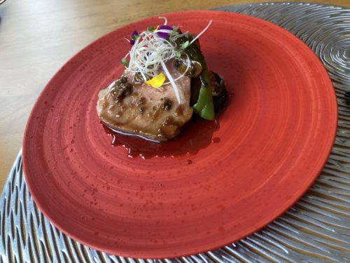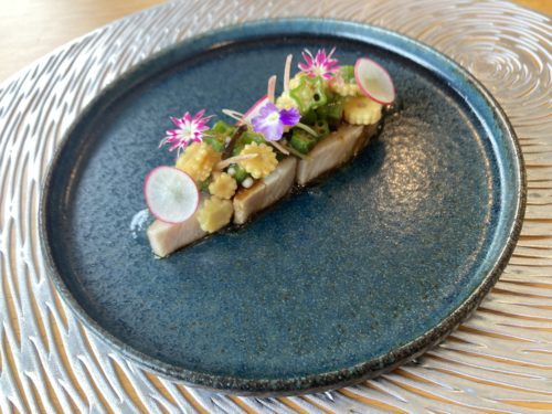 2品目の前菜がこちら。美しすぎる!低温調理されたサバにオクラやヤングコーンなどの夏野菜を漬け込んだマリネが盛られています。
