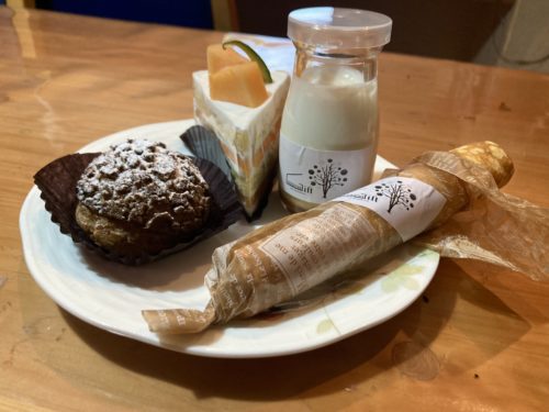 ショーケースに入ったデザートから、今回購入したのは、メロンのショートケーキ、ミニ溶岩シュー、ミニクレープ、ASOMILKと天草の塩を使用したプリン。ケーキ、クレープは甘すぎずに上品な味。シュークリームはカリッと、プリンはなめらか。デザートも買って間違いなしです。ホールケーキのオーダーも承っているそう。デザートは、イートインも可能です。