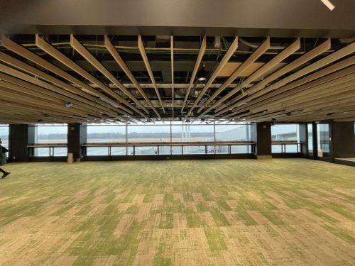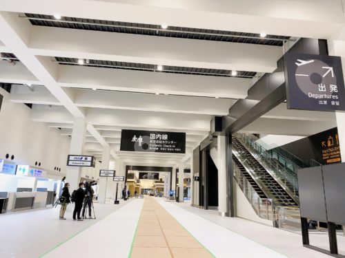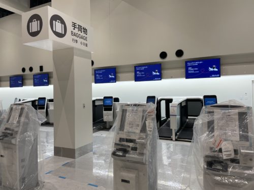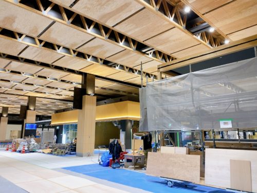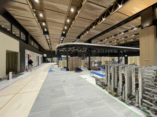 こちらもまだ工事中だったので全容は確認できなかったのですが、広さは約600平方メートルで、現国際線ターミナル免税店の10倍超の広さになるのだとか。地方空港でも有数の免税エリアに生まれ変わります。