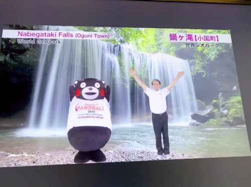 くまモンと蒲島県知事がラジオ体操を踊っています。なぜでしょう。ずっと見てられる。